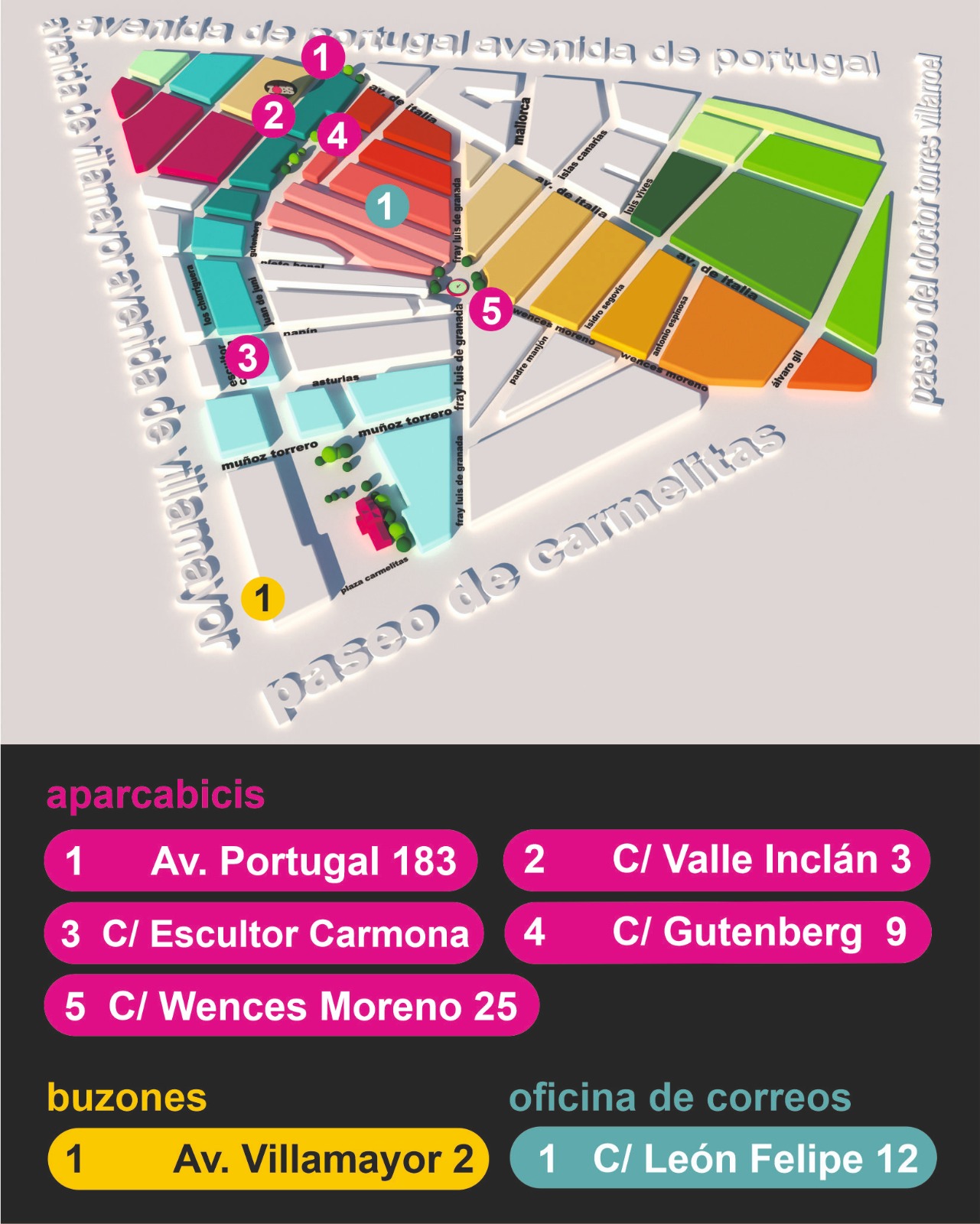 Presentamos el plano informativo con la localización de aparcabicis y buzones del Barrio del Oeste, pensado para mejorar la movilidad y el acceso a servicios del barrio.